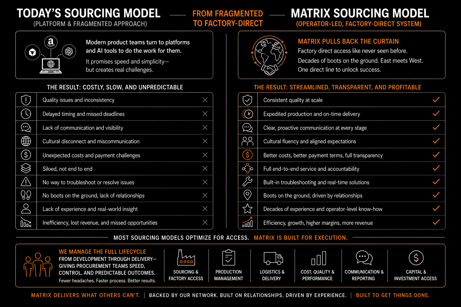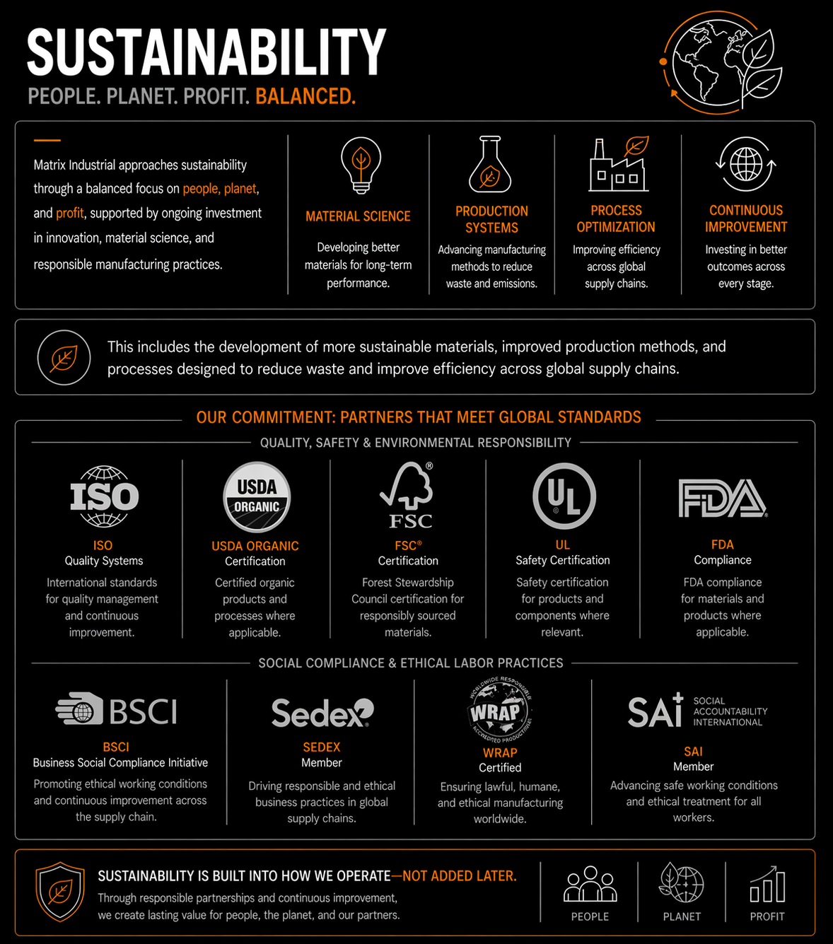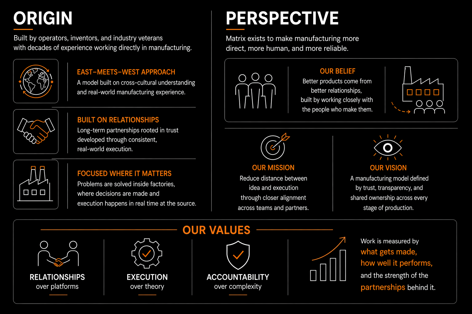 Matrix Industrial delivers flexible manufacturing models including Original Equipment Manufacturing (OEM), Original Design Manufacturing (ODM), Original Brand Manufacturing (OBM), private label production, contract manufacturing, and turnkey solutions, supporting brands, retailers, and industrial partners from concept through commercialization. With integrated capabilities across product development, sourcing, production management, quality control, and global logistics, the company provides direct factory access, transparent execution, and the infrastructure required to scale efficiently across four core industries.